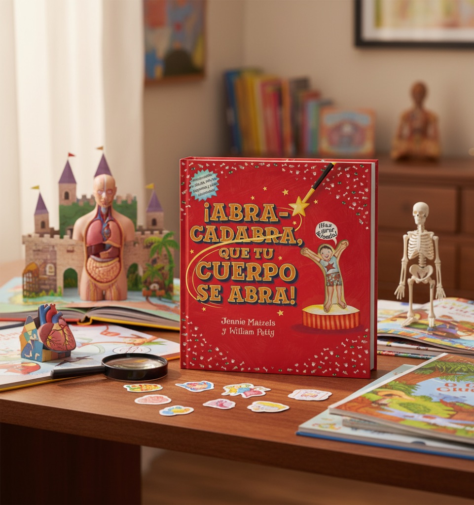 Cada página despliega órganos, músculos y sistemas en relieve, con solapas, ventanas y mecanismos que transforman la lectura en un recorrido interactivo por el interior del cuerpo.